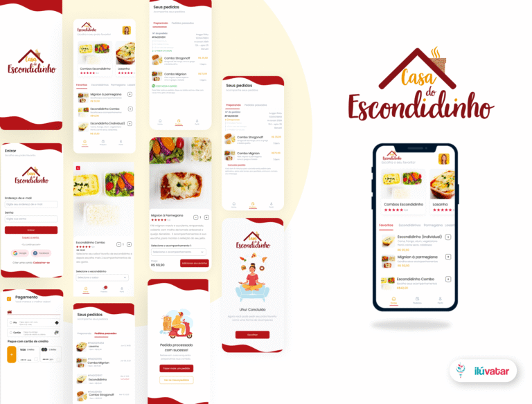 The Casa do Escondidinho project was a comprehensive exercise in End-to-End Product Design. Beyond building the Branding foundation for franchisability, I dove deep into Product Discovery and UX/UI, designing the entire digital user experience. I developed the technological ecosystem from scratch, from mapping User Flows to the navigable high-fidelity prototype of the ordering app. +4